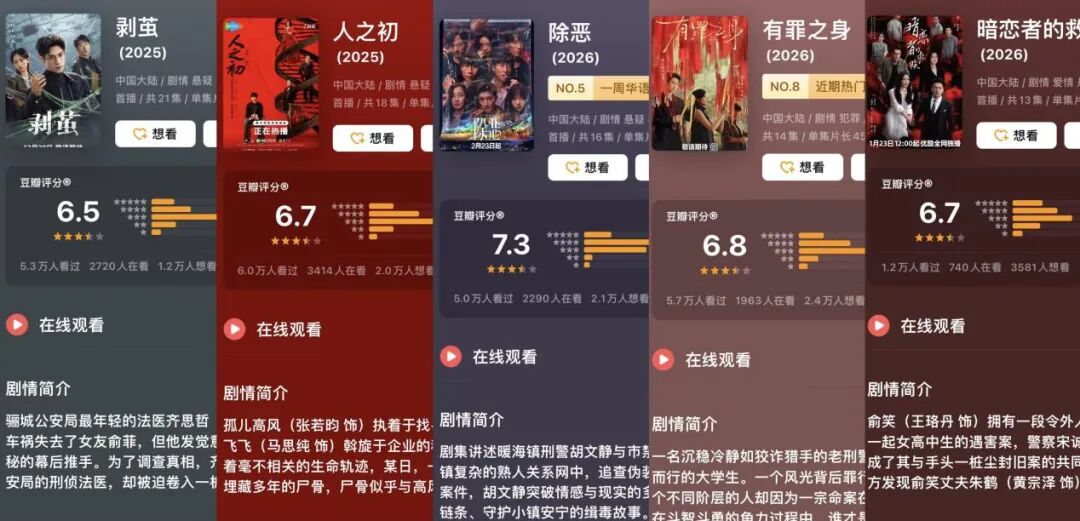 早在跨年档期间,腾讯视频X剧场与优酷白夜剧场就分别以《人之初》《剥茧》为矛,率先打响了第一枪。随后,爱奇艺迷雾剧场也接连打出了《有罪之身》《除恶》两张牌,与优酷白夜剧场推出的补位之作《暗恋者的救赎》展开第二轮正面抗衡。