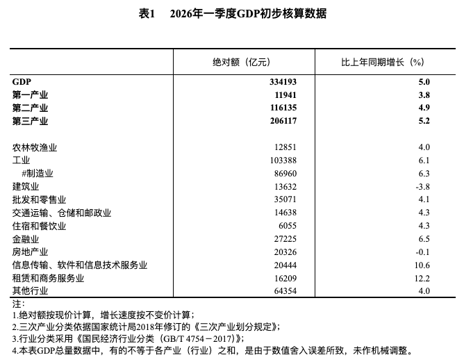 国家统计局发布2026年一季度国内生产总值初步核算结果。其中金融业比上年同期增长6.5%;房地产业比上年同期下降0.1%。