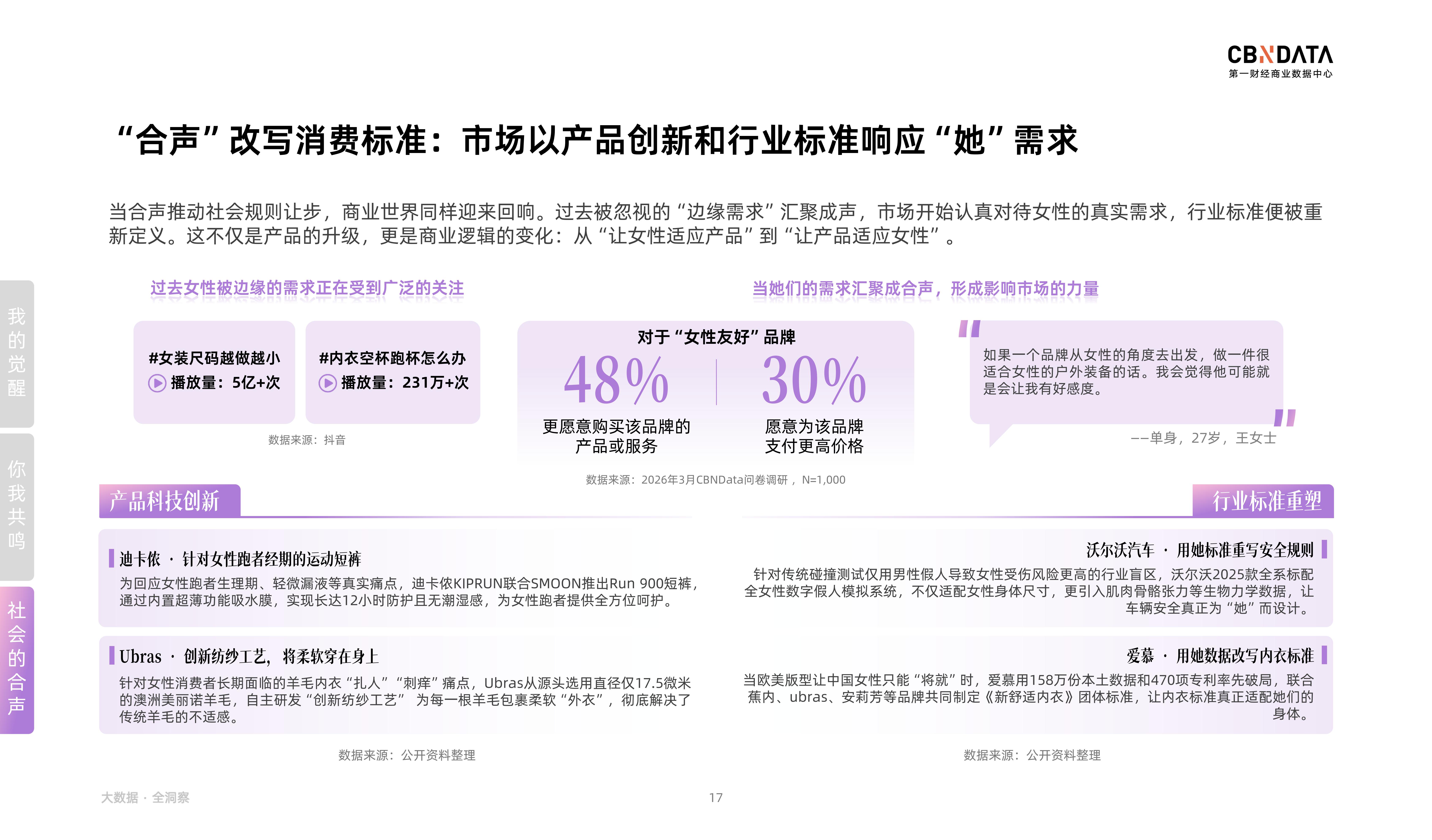 在市场层面,合声正在改写消费标准:品牌从 “让女性适应产品” 转向 “让产品适应女性”:沃尔沃标配全女性数字假人模拟系统,让车辆安全真正为“她”设计;爱慕联合多品牌制定《新舒适内衣》团体标准,终结版型“将就”;迪卡侬推出经期运动短裤,回应女性跑者的隐秘痛点……这些创新不断落地,行业标准开始适配女性真实需求。