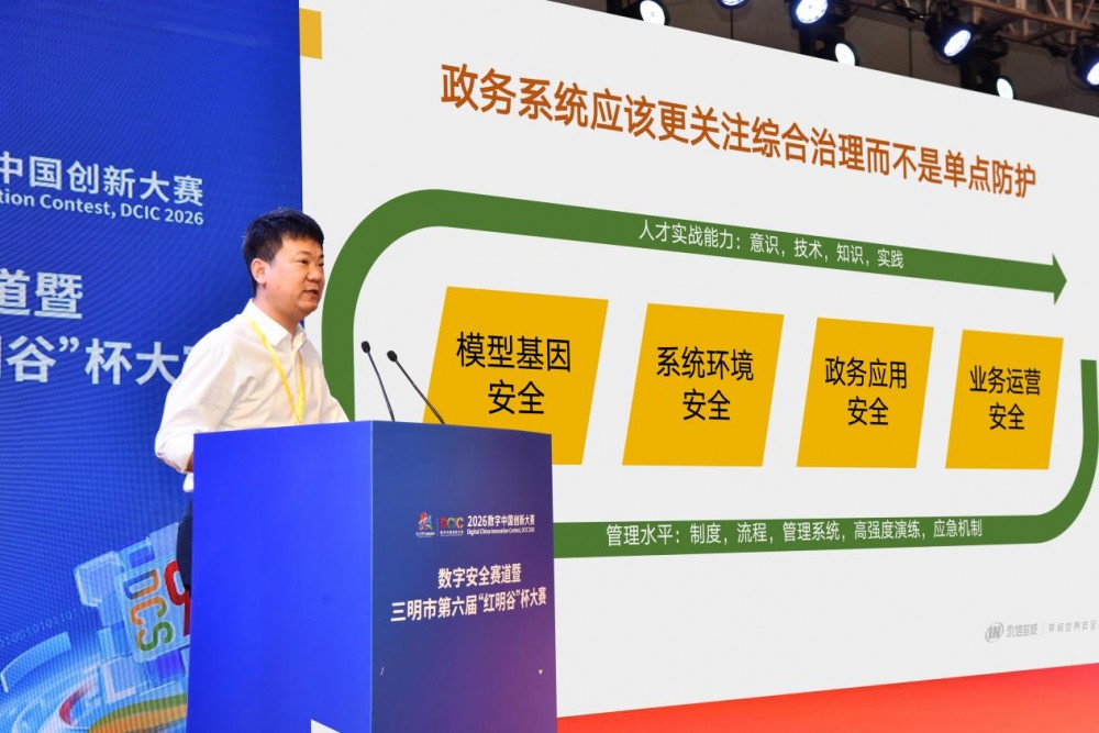 4月10日,由数字中国建设峰会组委会主办,福建省数据管理局、三明市人民政府承办的2026数字中国创新大赛数字安全赛道暨三明市第六届“红明谷”杯公共数据安全赛(攻防赛)决赛在福建三明举行。永信至诚副总裁付磊受邀出席开幕式,并发表《AI政务应用数据安全介绍》主题演讲。付磊指出,在AI快速发展的背景下,传统安全防护手段已不足以应对新型威胁,必须从认知升级、管理体系优化和实战演练等多维度构建系统性防御机制。