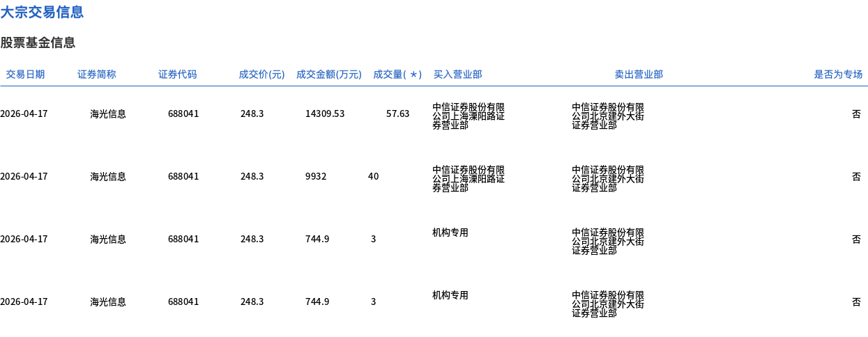 4月17日,海光信息大宗交易成交103.63万股,成交额2.57亿元,占当日总成交额的2.9%,成交价248.3元,较市场收盘价260元折价4.5%。