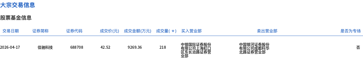 4月17日,佳驰科技大宗交易成交218万股,成交额9269.36万元,占当日总成交额的63.71%,成交价42.52元,较市场收盘价53.39元折价20.36%。