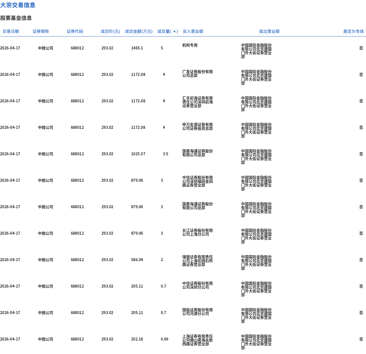 4月17日,中微公司大宗交易成交33.59万股,成交额9842.53万元,占当日总成交额的2.21%,成交价293.02元,较市场收盘价314元折价6.68%。