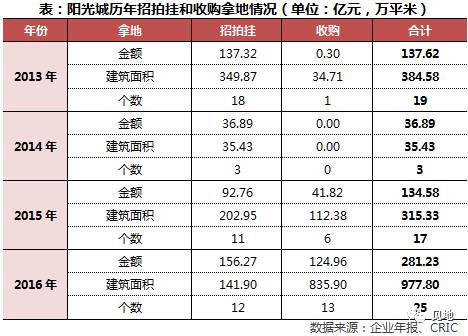 从上图可看出,2013-2014年,阳光城在收购方面的投入和收获几乎为零,2015年开始有了零星收获,直至2016年,阳光城豪掷125亿元,总共获得13个项目(55宗地块),计容建筑面积达到836万平方米。也因为收并购上的突破,阳光城2016年新增土储977.8万平方米,是2015年315.33万平方米的3倍有余。