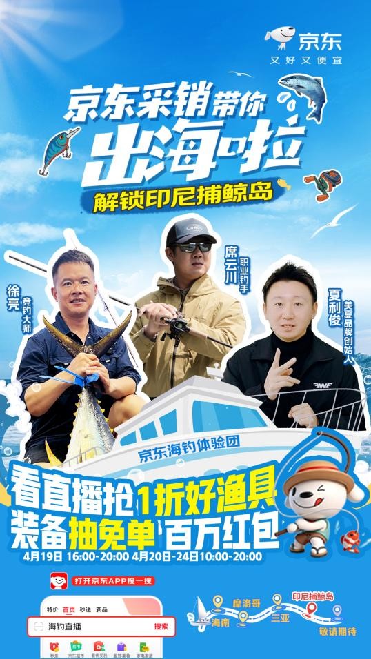 4月19日至24日,打开京东APP搜索“海钓直播”直达“京东垂钓采销直播间”,围观京东印尼海钓团深海钓巨物,解锁专业海钓装备,一站购齐渔具与户外好物,沉浸式收获海钓乐趣与超值福利。