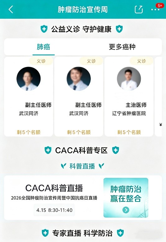 与此同时,专区还推出系列名医直播。中国医学科学院肿瘤医院大外科教研室副主任邵康主任医师与首都医科大学附属北京胸科医院肿瘤中心主任林根主任医师做客直播间,围绕“早筛是防,规范治疗也是防”主题展开深度科普,倡导从“被动治病”转向“主动防治”。