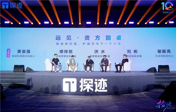 在资方圆桌环节,软银愿景投资总监傅炜铭、凯辉基金投资总监洪水、启明创投副总裁刘彬、九合创投合伙人谢振亮同台对话。这四家机构均是探迹多轮融资的参与者,有的已陪跑近十年。