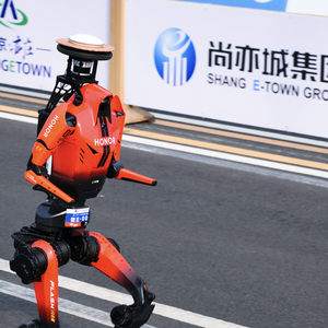 4月19日,在2026北京亦庄人形机器人半程马拉松赛场上,来自荣耀机器人的“闪电”以净用时50分26秒的成绩冲线,获得冠军。