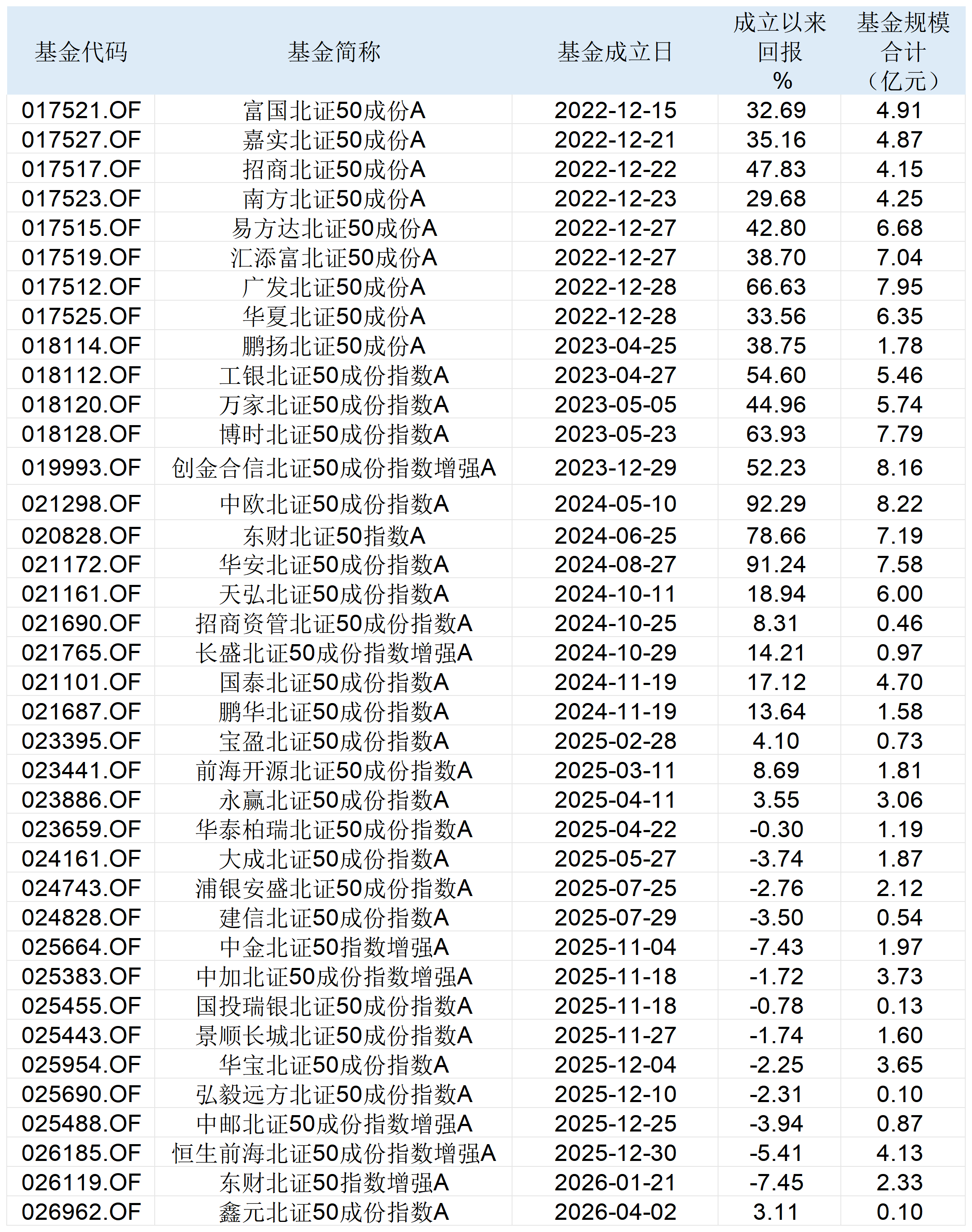 2022年12月,首批8只北证50成份指数基金陆续成立。截至目前,市面上共有38只同类产品,合计规模为141.76亿元。由于成立时间不同,北证50成份指数基金的收益率也各不相同,其中中欧北证50成份指数成立至今的回报率达到了92.29%,截至2025年末规模合计为8.22亿元。