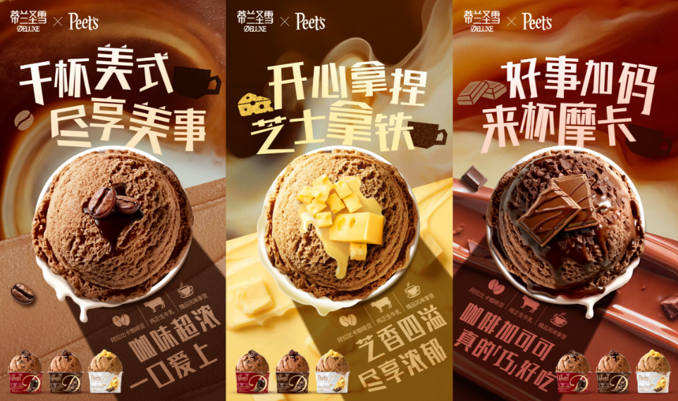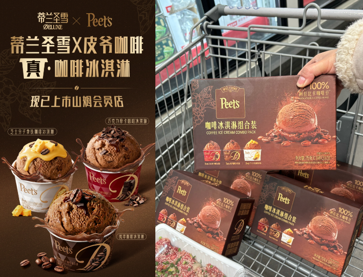 它们在山姆渠道推出的蒂兰圣雪×皮爷咖啡联名咖啡冰淇淋组合装,甄选添加皮爷咖啡浓缩液,采用100%阿拉比卡咖啡豆与牧场直供优质生牛乳,并提供多种风味选择。从第一口开始,它给人的直觉并不像传统冰淇淋,更接近一杯被瞬间凝固的精品美式。