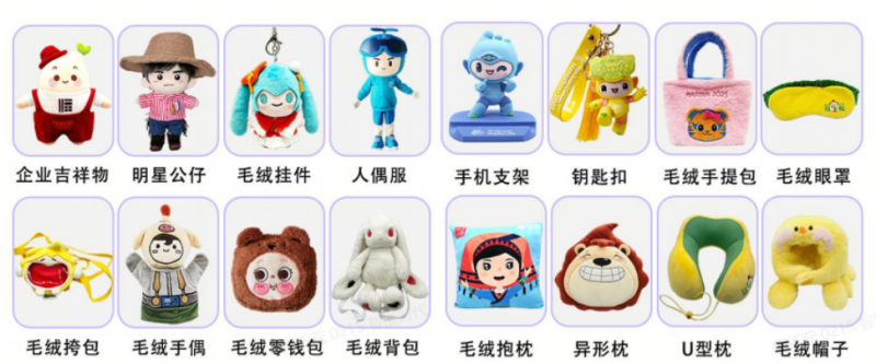 ◦ 配饰周边类:毛绒挂件、钥匙扣、手机支架、毛绒手提包 / 挎包 / 零钱包。