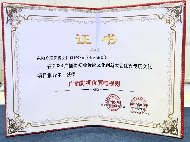 欢娱影视凭借在传统文化传承、精品内容创作与产业创新实践中的突出表现,一举斩获三项荣誉:欢娱影视获评“广播影视杰出贡献机构”;欢娱影视联合创始人、总经理杨乐获评“广播影视文化传播影响力人物”;欢娱影视出品的古装爱情悬疑剧《玉茗茶骨》获评“广播影视优秀电视剧”。