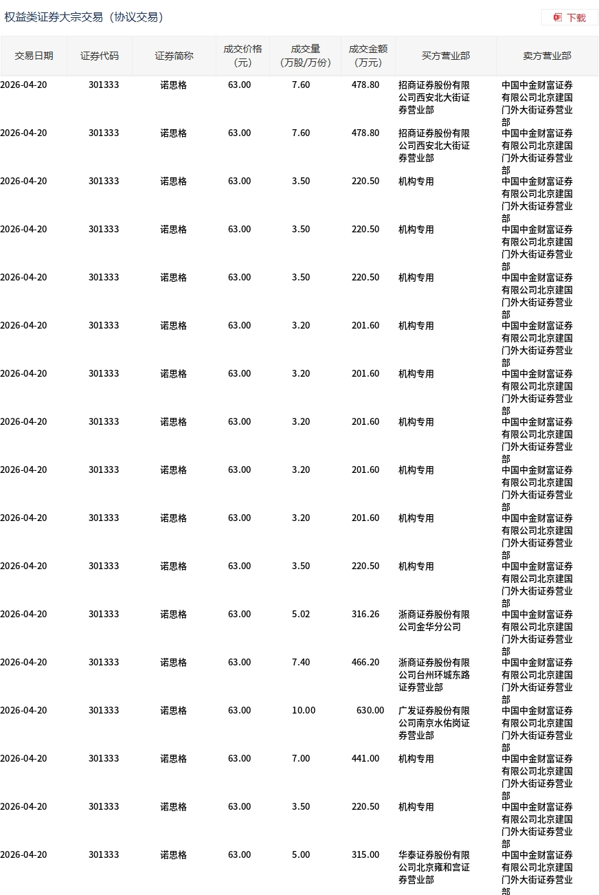 4月20日,诺思格大宗交易成交83.12万股,成交额5236.56万元,占当日总成交额的34.22%,成交价63元,较市场收盘价68.62元折价8.19%。