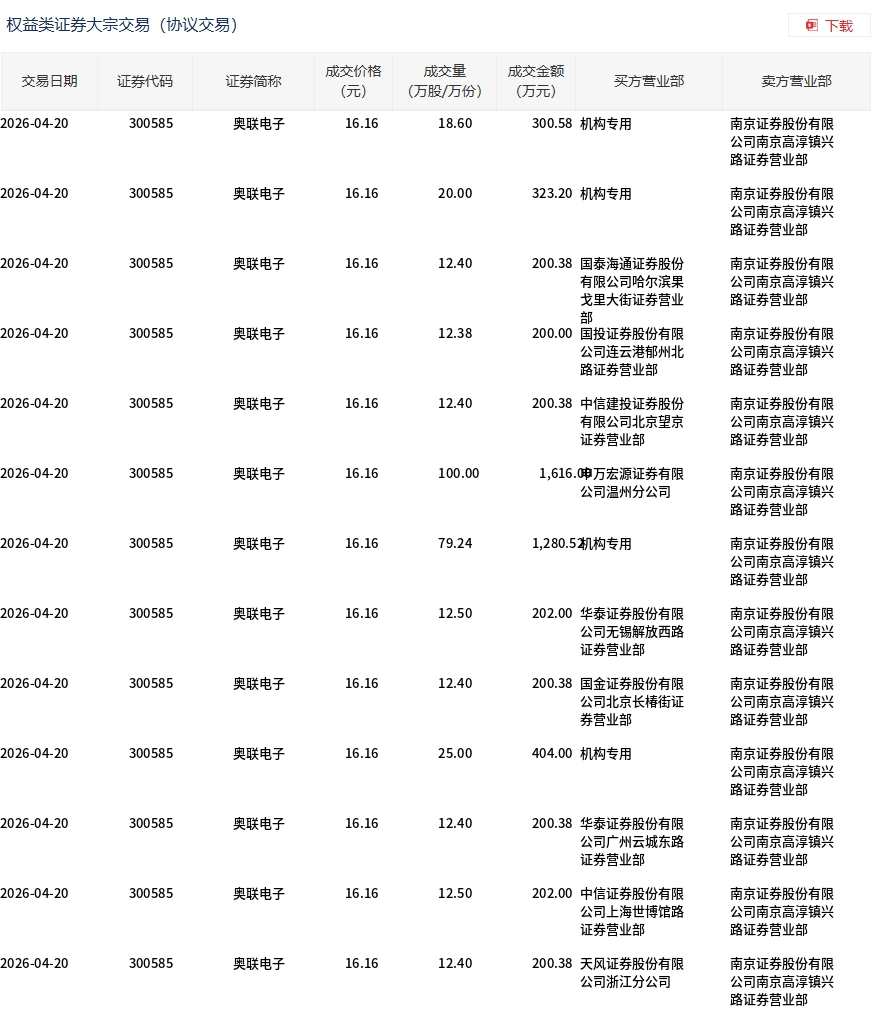 4月20日,奥联电子大宗交易成交342.22万股,成交额5530.2万元,占当日总成交额的29.27%,成交价16.16元,较市场收盘价18.22元折价11.31%。