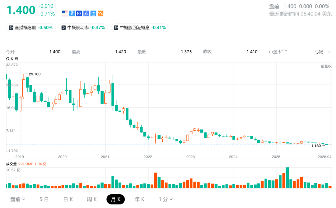 而从资本市场看,爱奇艺的股价从2018年上市后的高点已大幅回落,截至2026年4月,市值仅约13亿美元。2025年财报显示,公司总营收同比下降7%,并出现了净亏损。