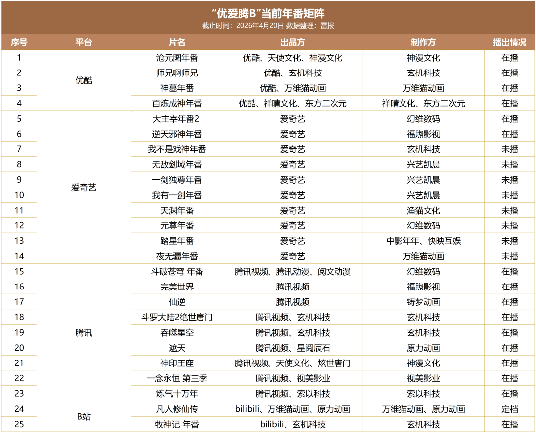 但爱奇艺在年番赛道上,只是一个迟到的追赶者。腾讯视频的《斗罗大陆》在2018年就开启了年番时代,B站《凡人修仙传》在2020年跟进,优酷《师兄啊师兄》在2024年升级为年番,2023年开播的《沧元图》也于今年加入战局。