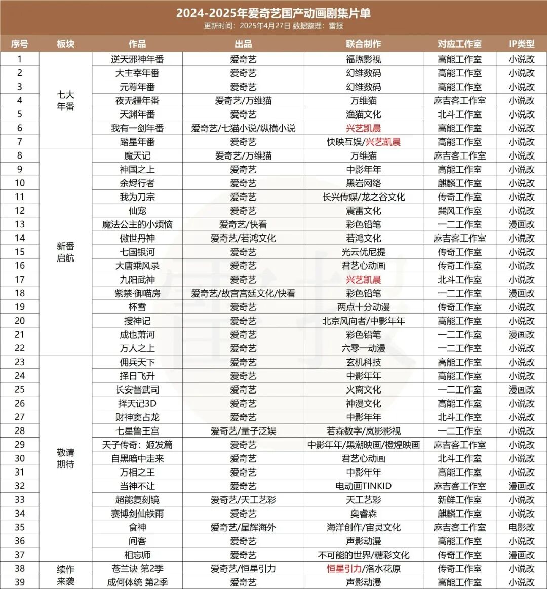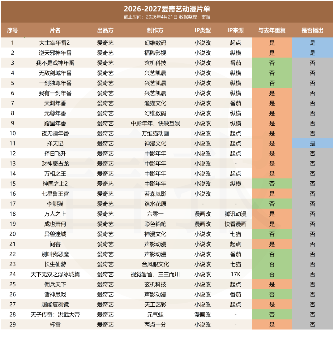 雷报统计发现,此次公布的29个项目片单中,与去年片单重合或属系列续作的项目至少有18个,占比超过六成(人工统计存在误差)。IP还是那些IP,续作还是那些续作,换了个年份继续排兵布阵——爱奇艺动漫的创新能力,似乎就止步于这份不断自我引用的列表了。