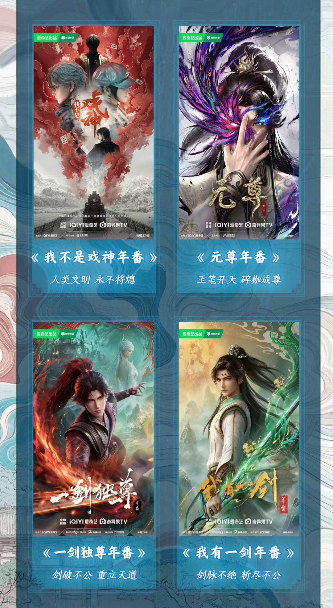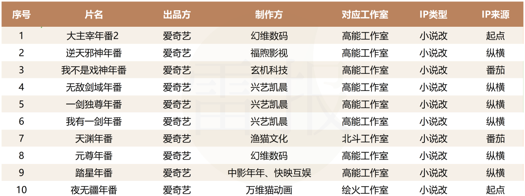 爱奇艺动漫在去年官宣了7部年番储备,仅兑现《大主宰年番》《逆天邪神年番》2部。最新片单则在去年的基础上,新增《我不是戏神年番》《无敌剑域年番》《一剑独尊年番》,总量达到10部。