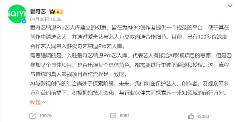 我们还能看到,在追赶体量的同时,爱奇艺整体的内容战略展现出了一种更为激进的,依赖AI技术杠杆的发展思路,这在开篇提到的“纳逗Pro AI艺人库”引发的震荡中已经显露。