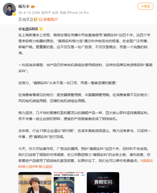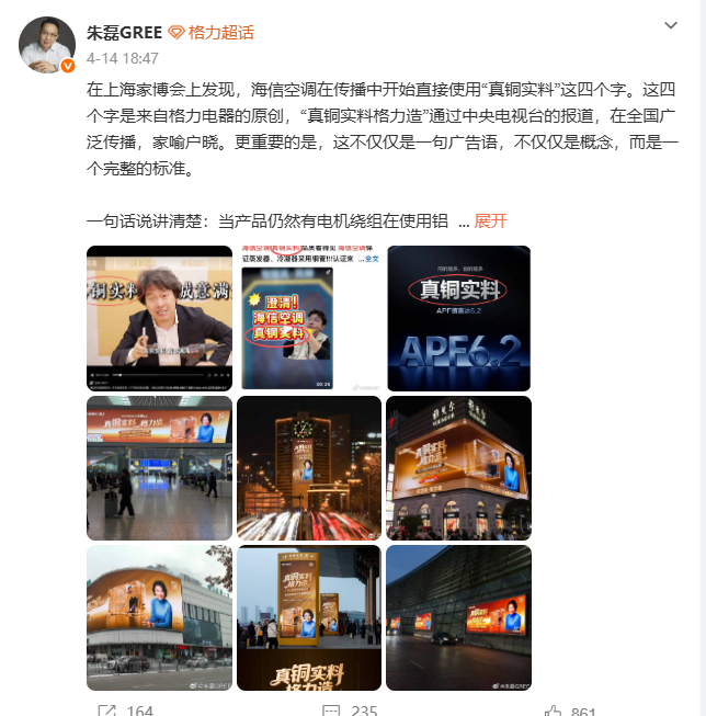 4月14日,格力电器市场总监朱磊在社交平台发文,称“真铜实料”是格力原创宣传语,质疑海信在上海家博会上使用该词汇属于“剽窃”,并明确格力所定义的“真铜实料”需覆盖蒸发器、冷凝器、风机电机绕组、压缩机电机绕组四大核心部件全铜配置,指责海信未满足全铜要求却滥用该表述。