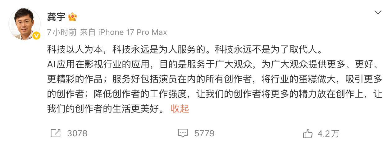 比如强调艺人入驻仅代表其有接洽AI影视项目的合作意向,是否参演及以何种形式参演,均需根据具体项目另行单独洽谈,与现行的传统真人影视项目合作流程一致;爱奇艺创始人兼CEO龚宇也连发微博,强调“科技以人为本,科技永远是为人服务的。科技永远不是为了取代人。”