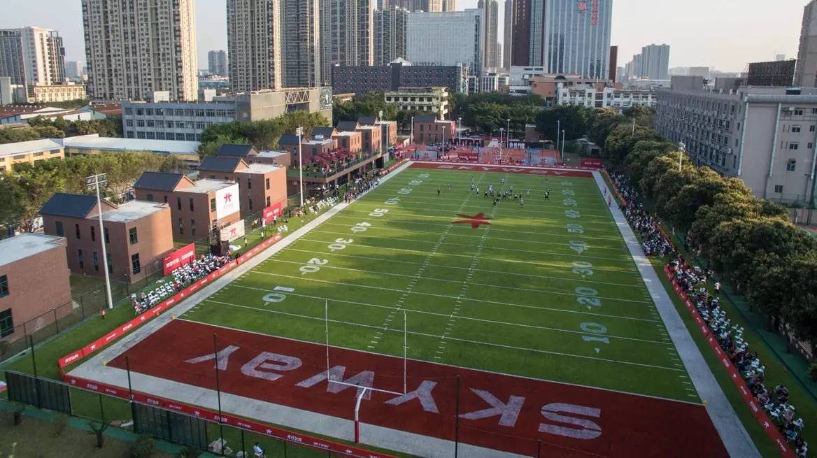 ▼鸟瞰国内第一座标准美式橄榄球球场——天行中心