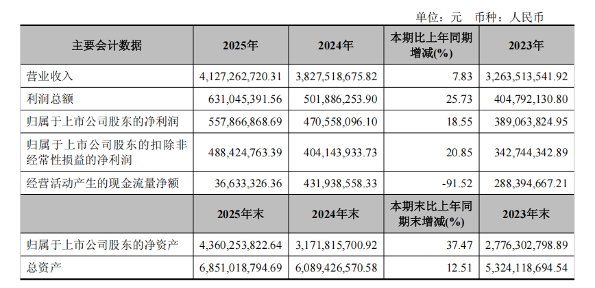 近日,华翔股份(603112)发布2025年年报。数据显示,公司2025年实现营业收入41.27亿元,同比增长7.83%;归母净利润为5.58亿元,同比增长18.55%。