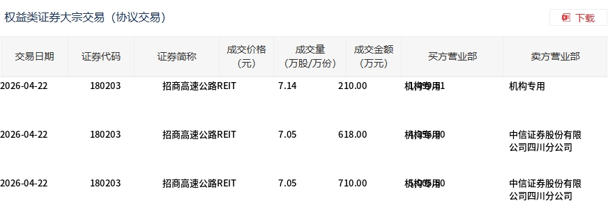 4月22日,招商高速公路REIT大宗交易成交1538万股,成交额1.09亿元,占当日总成交额的94.33%,成交均价7.06元,较市场收盘价7.36元折价4.04%,其中最高成交价7.14元,最低成交价7.05元。