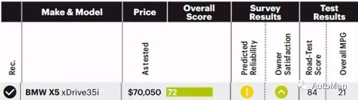 宝马X5在很多人眼里誉为Dream Car,外形漂亮,操控在SUV车型里也算是出类拨萃。路测得分84,推荐的车型里,除了奥迪Q7就是最高了。但是可靠性只有中等的成绩,反正用好宝马的质保,或者说宝马的质保是最物有所值的。