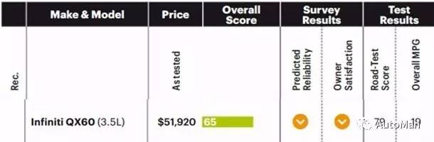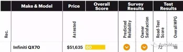 英菲尼迪QX70的配置和竞品相比差距略大,落后于竞品较多。可能唯一的好处就是动力系统比较成熟,问题少,重心低驾驶感好了。这货的后方视野和内饰储物空间的设计上评价都不是很好,可靠性和车主满意度也证实了这一点,都没得到很高的分数,这车其实已经该换代了。