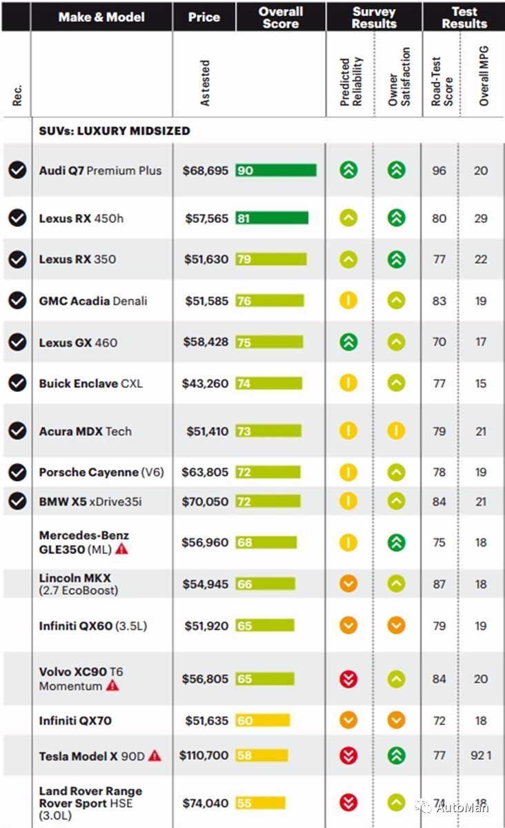 依据《美国消费者报告》对各个级别的车进行了综合大比拼后,又分别对车辆的可靠性、道路测试、乘坐舒适度等方面做了评测之后的排名,来分析的。今天给大家看看中型豪华SUV有哪些?虽然有的与国内的合资车型存在一定差异,但是有些车型为进口销售,有些车型国产了,参考着来吧。