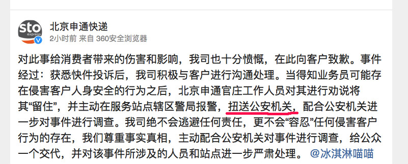 随后,下午15点22分,“北京申通快递”发布微博称,已“对其(打人者)进行劝说将其‘留住’,并主动在服务站点辖区警局报警,扭送公安机关”。