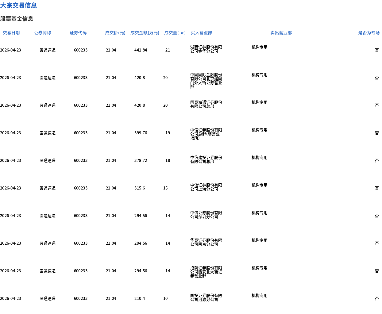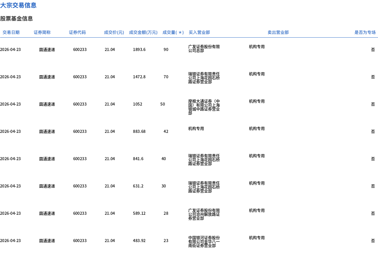 4月23日,圆通速递大宗交易成交538万股,成交额1.13亿元,占当日总成交额的8.06%,成交价21.04元,较市场收盘价22.38元折价5.99%。
