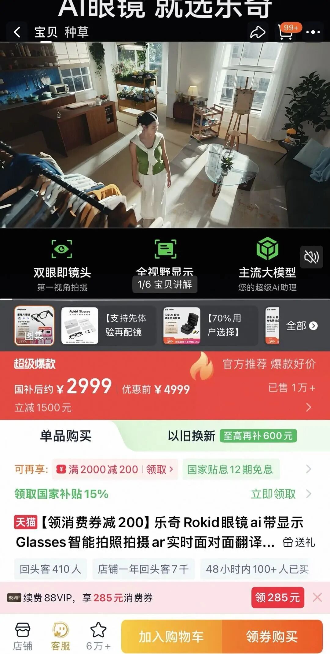 在Rokid天猫旗舰店中,其爆款产品Rokid Glasses搭载多款主流大模型,不仅对外开放生态,还支持各种AI进阶玩法,截至4月23日晚,国补后价格为2999元,店铺内已销售1万+件。