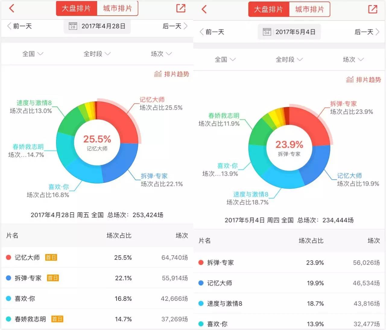 从2017年4月28日到5月5日《银河护卫队2》上映之前,五一档中类型化差异显著的四大国产片居于优势地位今年6月23日,金砖国家电影节在成都开幕。官方首次披露,截至目前,我国电影银幕数已超过4.5万块,超越美国成为电影银幕最多的国家。在如此快速的影院建设和巨大的市场需求下,国产电影明显喂不饱自己的观众。