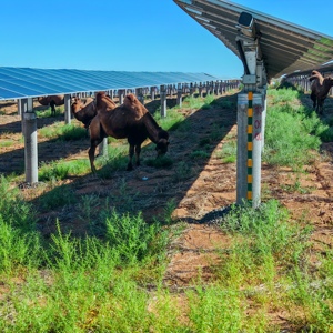 骆驼在生态治理后的宁夏腾格里“沙戈荒”新能源基地光伏下觅食,图片来源:国家能源集团龙源电力