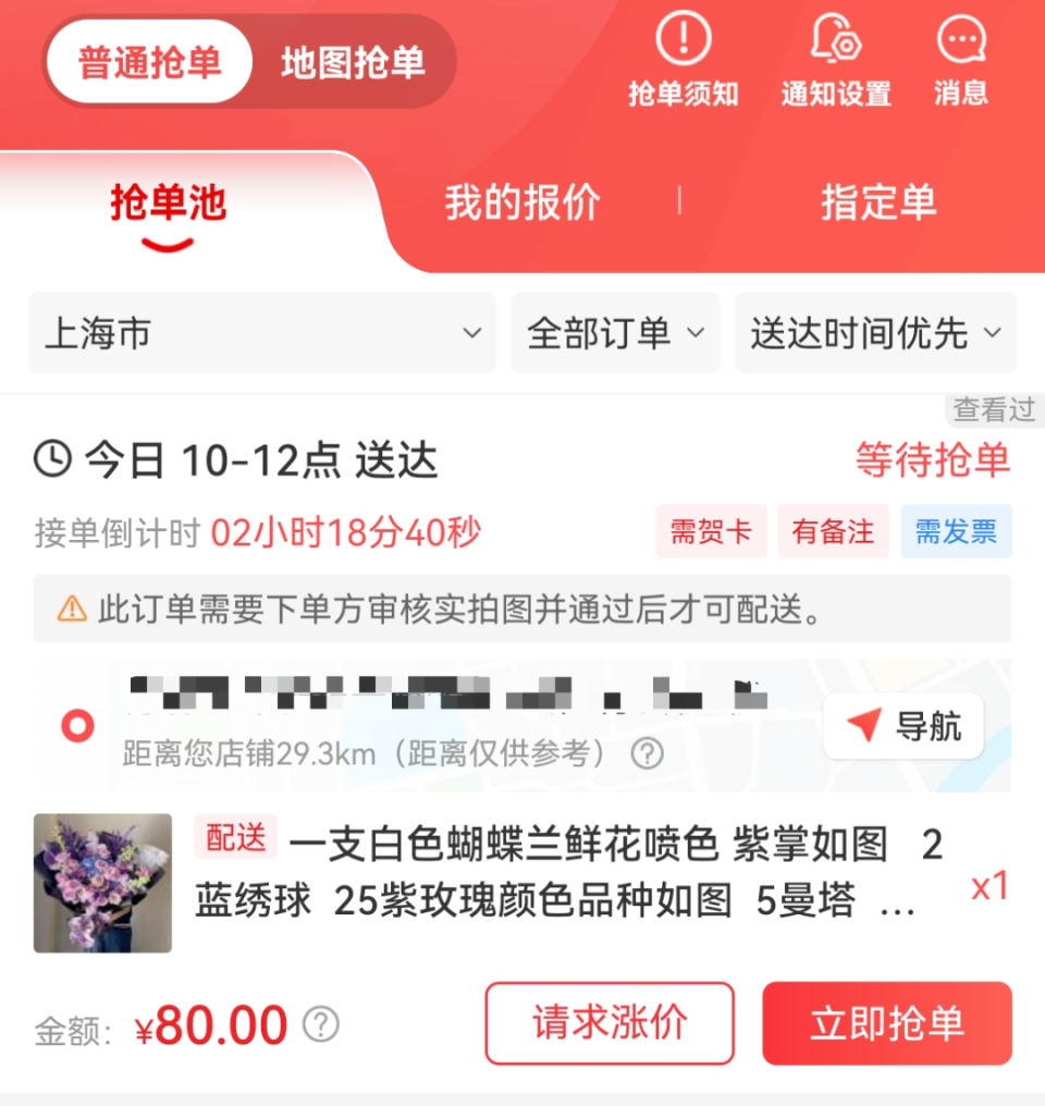 目前,业内比较知名的鲜花转单平台是花娃。记者以“花店”身份注册了花娃App,平台的核心功能便是“抢单”,页面上是来自全国各地的鲜花订单,每条订单信息都包含配送地址、送达时间、花束规格描述以及报价。这个“报价”,正是线上店铺抛给实体花店的“一口价”。
