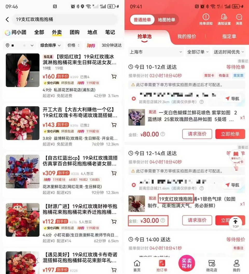 《IT时报》记者观察到,一份“19支红玫瑰抱抱桶+1个银色气球”的订单报价仅30元,若按照这一需求在电商和外卖平台上进行搜索,同类产品显示的价格在110~160元不等,差价高达四五倍;另一单“1朵白色蝴蝶兰+2朵蓝绣球+25朵紫玫瑰+5朵曼塔玫瑰”抢单报价80元,但在电商和外卖平台,仅25朵紫玫瑰的售价就已经在80元左右,再加上其他的花束和包装材料,费用将近200元。