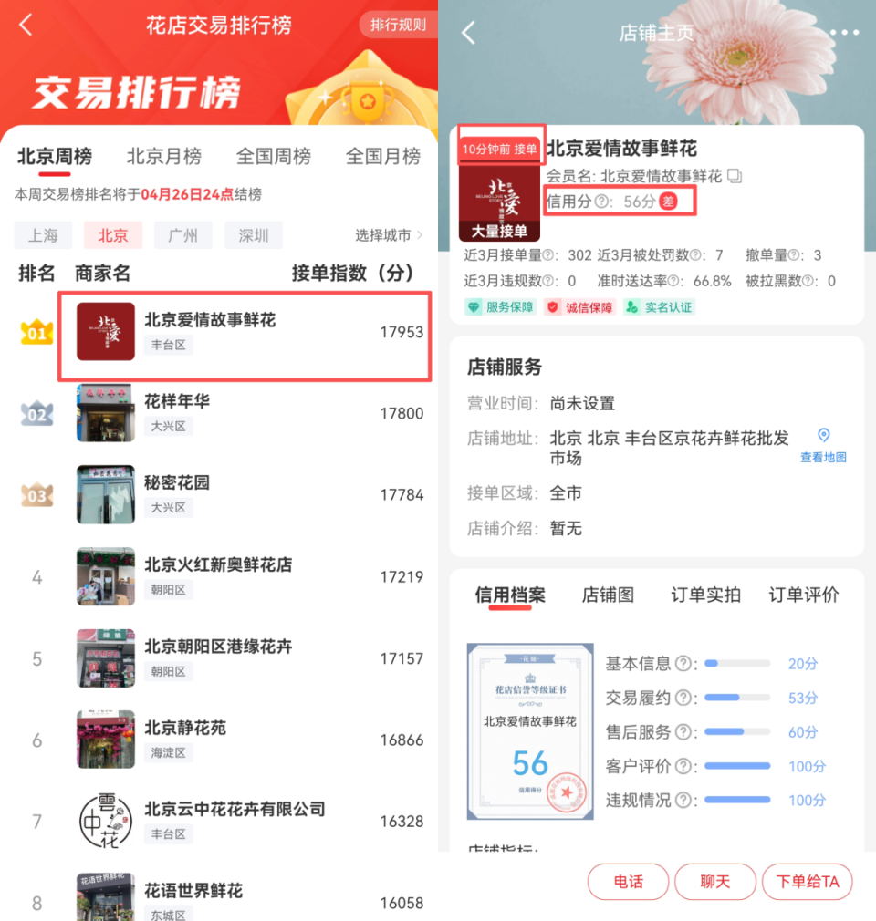劣币驱逐良币的机制由此完成了闭环:线上幽灵花店轻松坐收差价,一旦被投诉,关店换马甲重新上线;线下实体花店为了抢单,不得不陷入“低价内卷”,还可能像“布查德”那样,被人盗用工商信息,替对方背负所有投诉和差评。