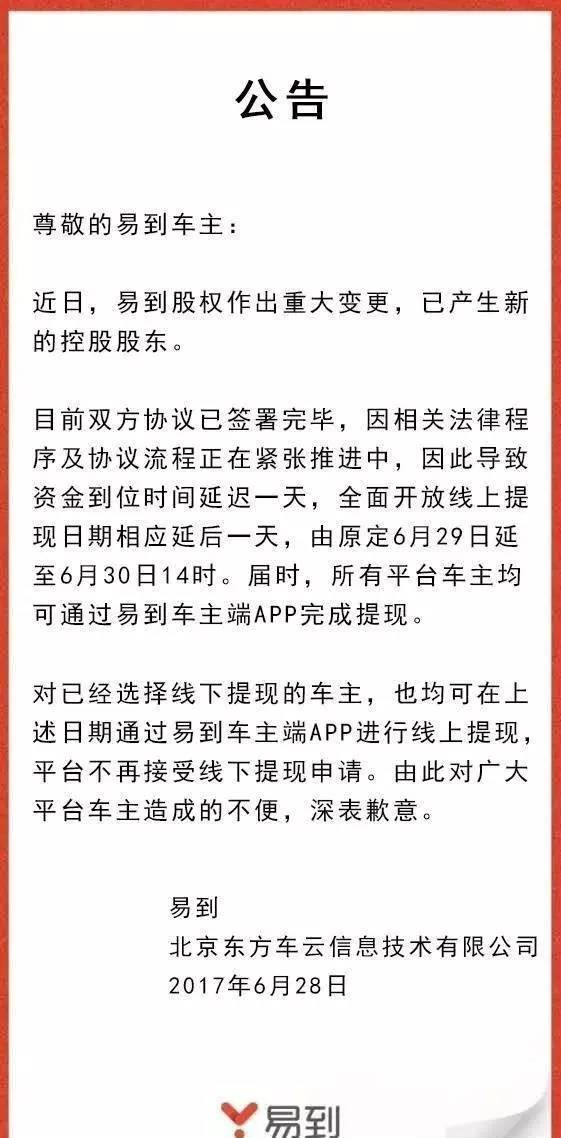6月28日,易到官方微博发布公告称,公司已经于近日变更控股股东,有新的控股股东进入,拟定于7月4日举行媒体沟通会,就具体事宜做出公开说明。原有管理团队继续负责易到的日常经营管理。