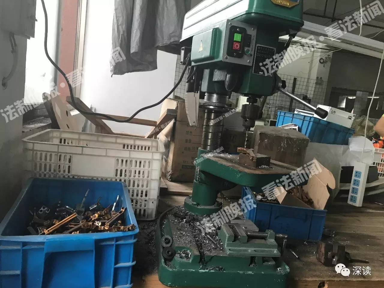 工作台前的8个箱子里,是两个星期前做好的成品。工作台上摆着多个格格的蓝色塑料盒,每个格里放着不同的零部件,钢丝、弹性钢片、小铆钉、弩体架分开放置。一些弩体架被放在台钻旁待调校。