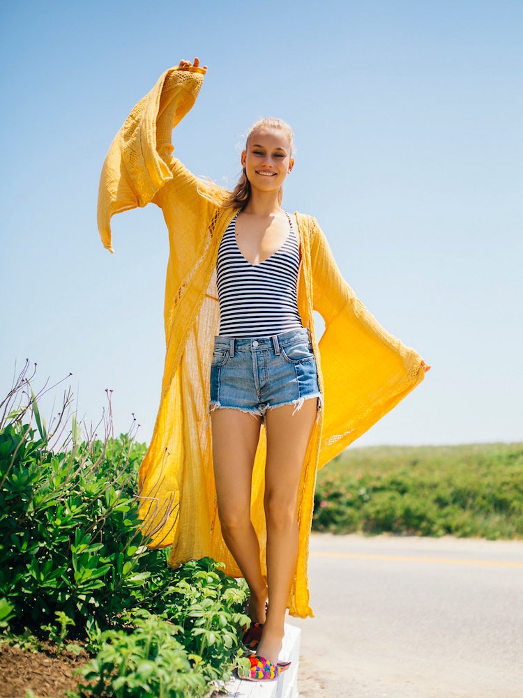 对于不想大胆秀身材的姑娘,在沙滩上穿一件罩衫可以免于暴露的同时也让时髦度上升。