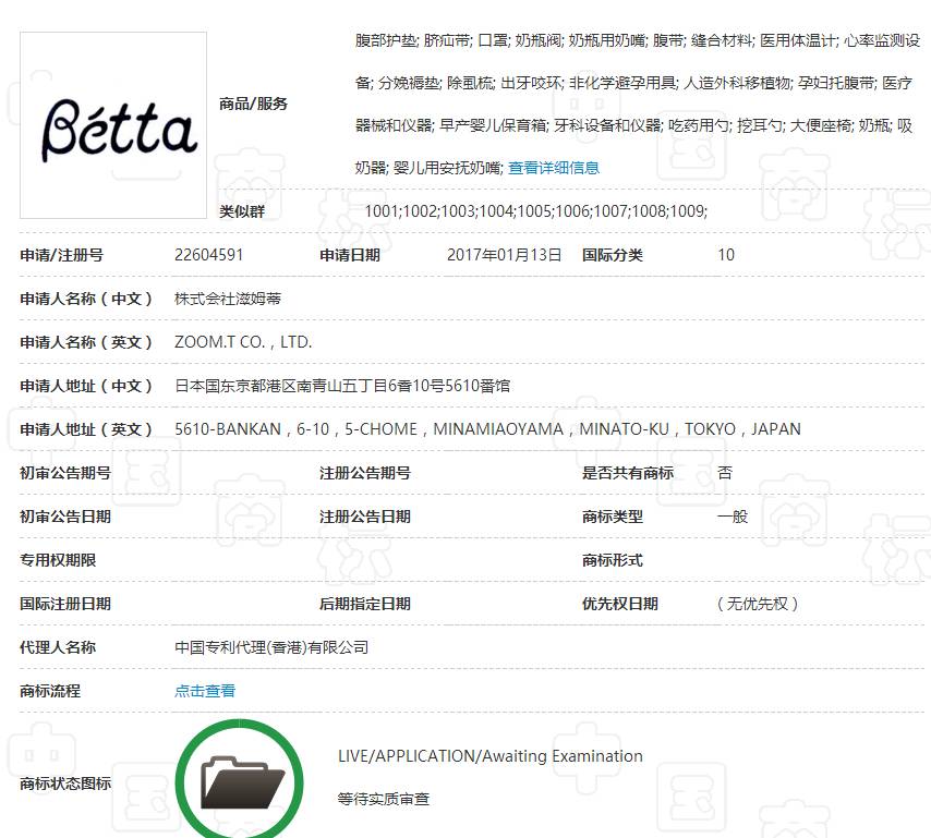经名商网查询,日本株式会社滋姆蒂已经于2017年01月13日在关键类别第10类奶瓶上申请注册“Betta”商标,目前该商标还在实质审查中。并且其还在婴儿床、婴儿服装等类别上也申请了“Betta”商标,因为申请时间较晚,目前也都在实质审查中。
