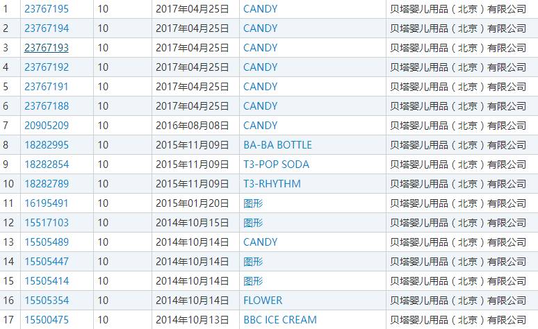 而贝塔婴儿用品(北京)有限公司并未在“奶瓶”这一核心类别上注册“Betta”商标,但不排除获得商标授权的可能。虽未注册“Betta”商标,但贝塔婴儿用品(北京)有限公司却在第10类上注册了多个其他商标,包括日本著名商标“MIKIMOTO”、“A BATHING APE”、以及日本Betta旗下系列“T3-POP SODA”、“T3-Rhythm”等商标。