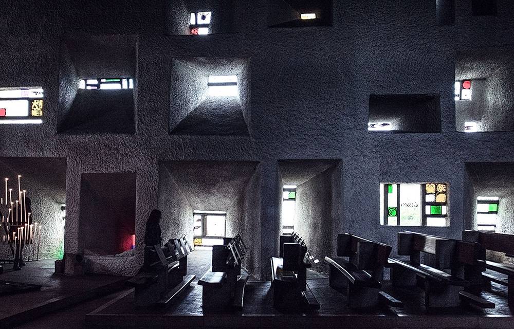 ▌ 这座教堂造型奇异,墙体几乎全是弯曲的,沉重的屋顶向上翻卷着,白色的墙面上开满镶嵌着彩色玻璃的窗洞,当光线透过屋顶与墙面之间的缝隙和镶着彩色玻璃的大大小小的窗洞投射下来,使室内产生了一种特殊的气氛。