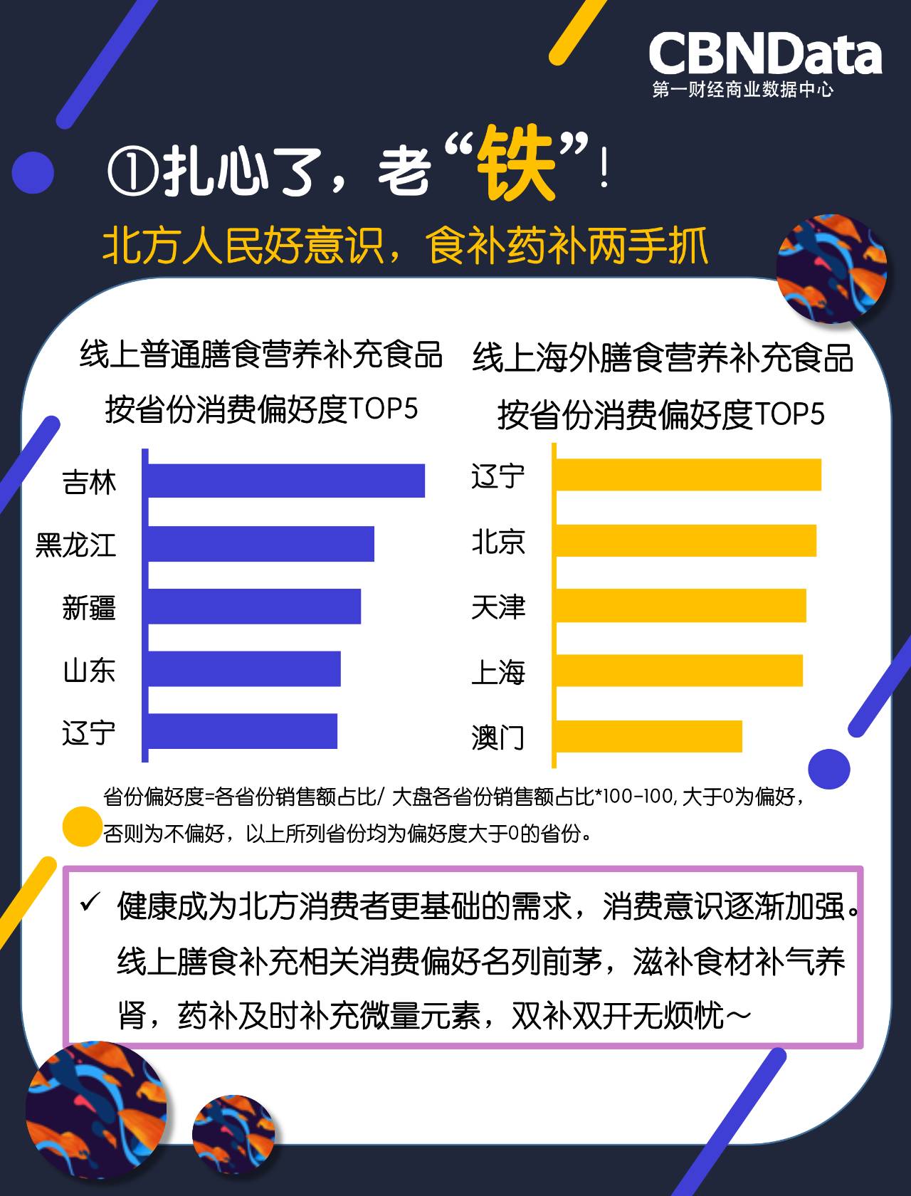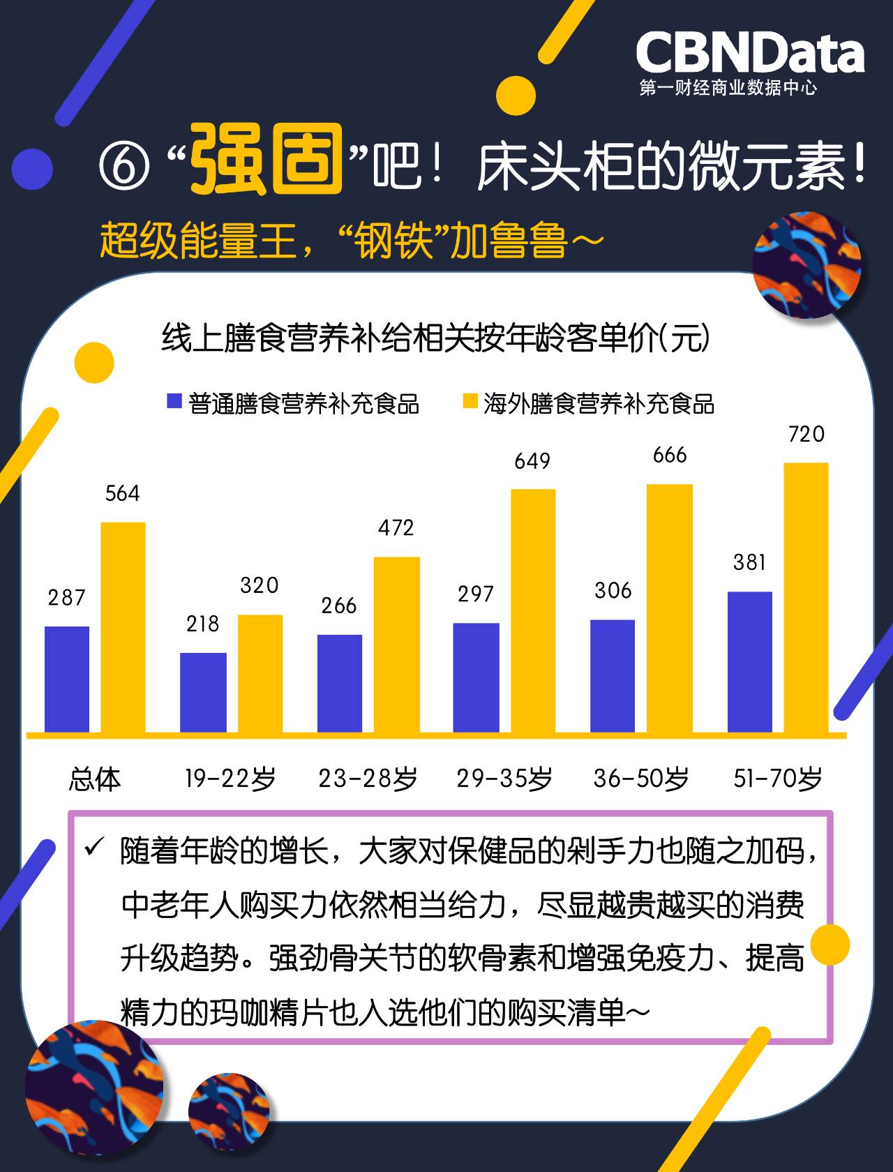 第一财经商业数据中心(CBNData)发布了《2017国民膳食营养相关系列研究》(以下简称《研究》)。CBNData《研究》基于阿里巴巴大数据,通过洞察2016年5月到2017年4月各个年龄段人群在不同功能膳食营养补充食品上的线上消费表现,还原国民“养生”消费现状。