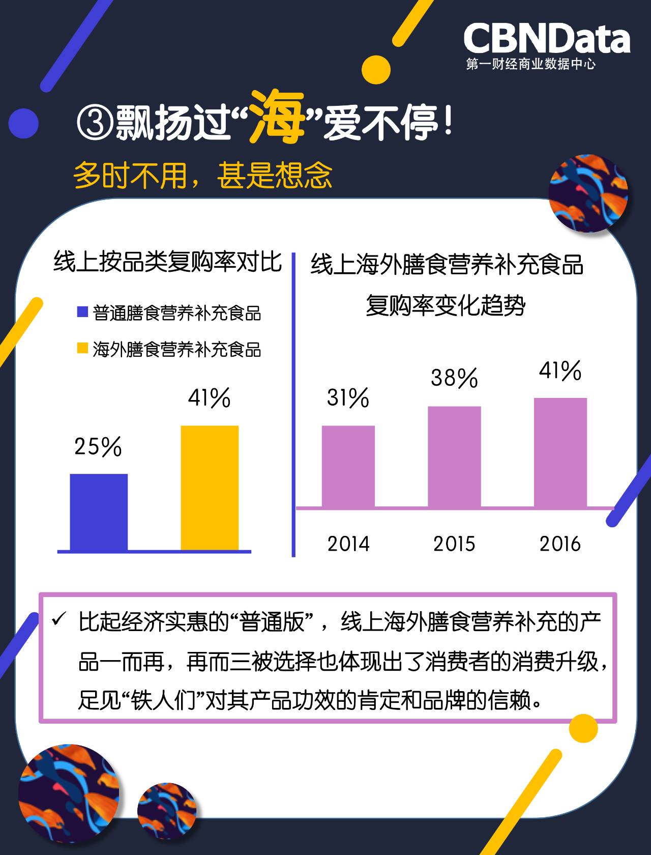 根据CBNData《研究》显示,比起经济实惠的“普通版”,消费者对线上海外版保健品的复购率更高,一方面,体现了消费者的消费升级,另一方面,也 见消费者对品牌的信赖。