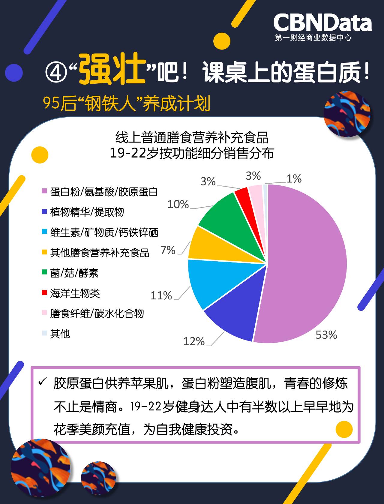 正值花季的95后年轻人,一方面还需要长身体,另一方面也对外貌日益重视,蛋白质的补给成为他们当下最大的需求,CBNData《研究》显示,19~22岁的保健品消费者中,半数以上已开始在胶原蛋白以及蛋白粉上投入消费,茁壮成长是学业的保障。