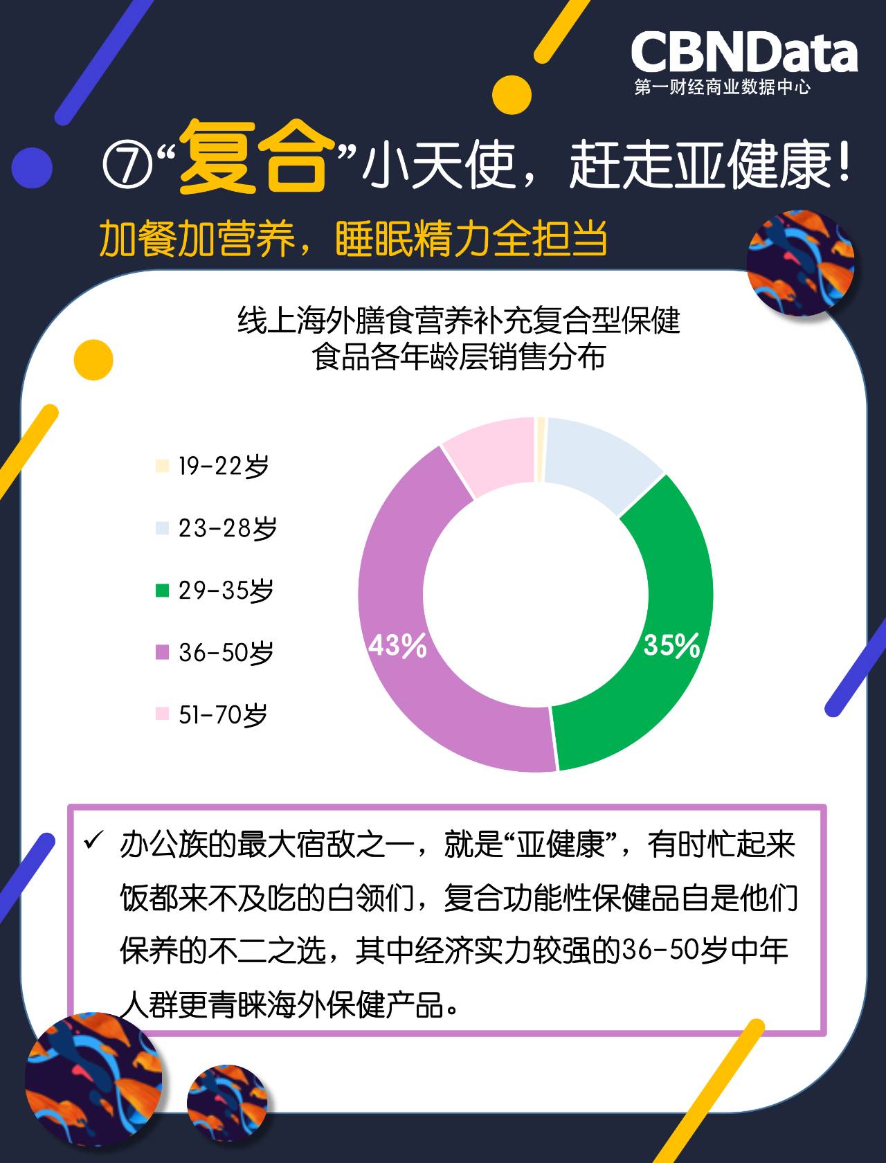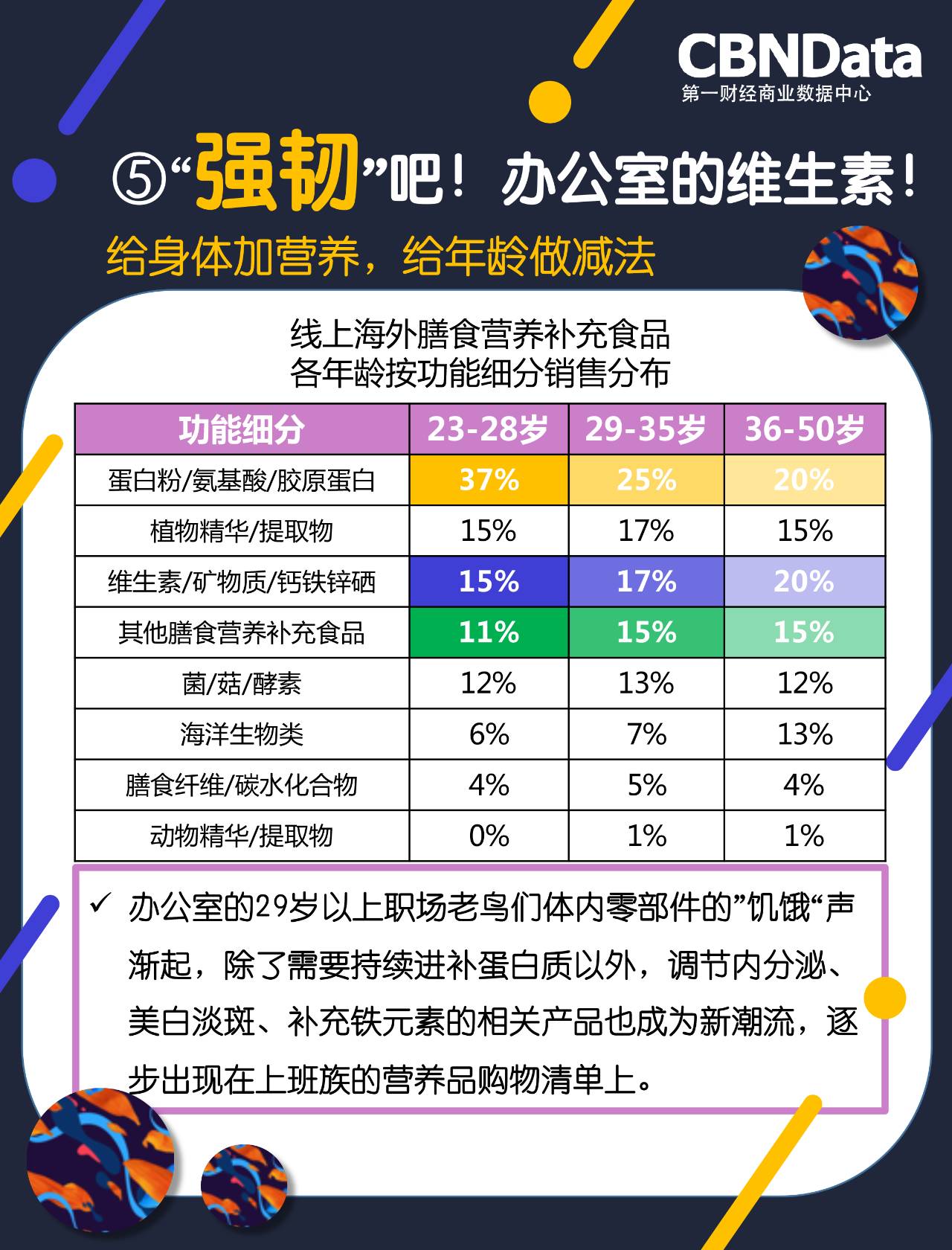 不论是加班狗还是失眠党,多多少少都与工作相关,外加缺乏运动,就餐时间不规律,让不少职场人士开始出现“亚健康”的症状,根据CBNData《研究》显示,23~50岁的消费者除了持续补充蛋白质补之余,对调节内分泌、美白淡斑、补充铁元素的相关产品消费开始加入保健品购买清单。