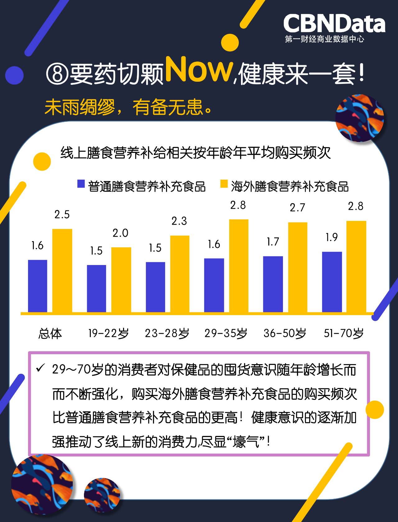 CBNData《研究》发现,补充蛋白质属国民膳食行为,95后年轻人尤其偏爱;29~50岁中青年人群的保健品消费结构中,补铁、调节内分泌等是他们的主要补给需求;51~70岁的中老年人群不仅购买力度最大,购买频次也是佼佼者。